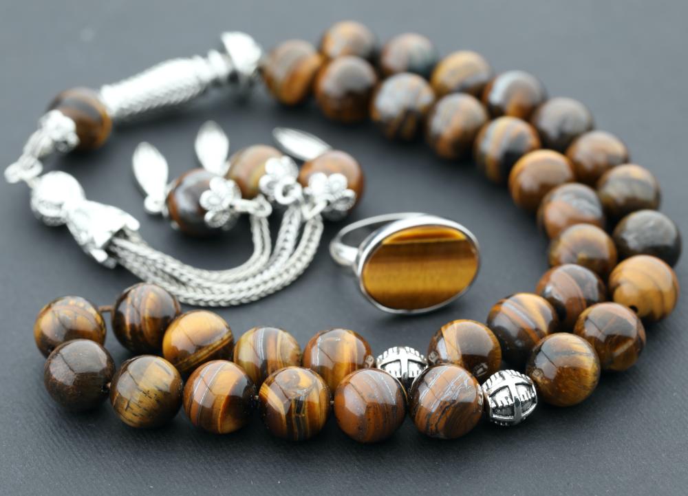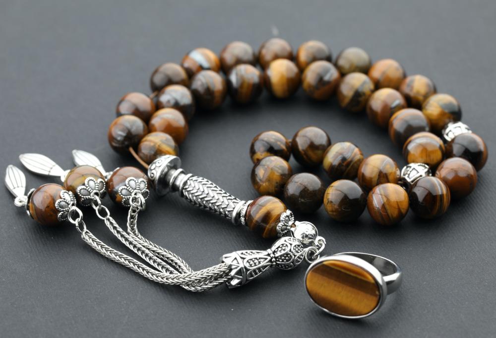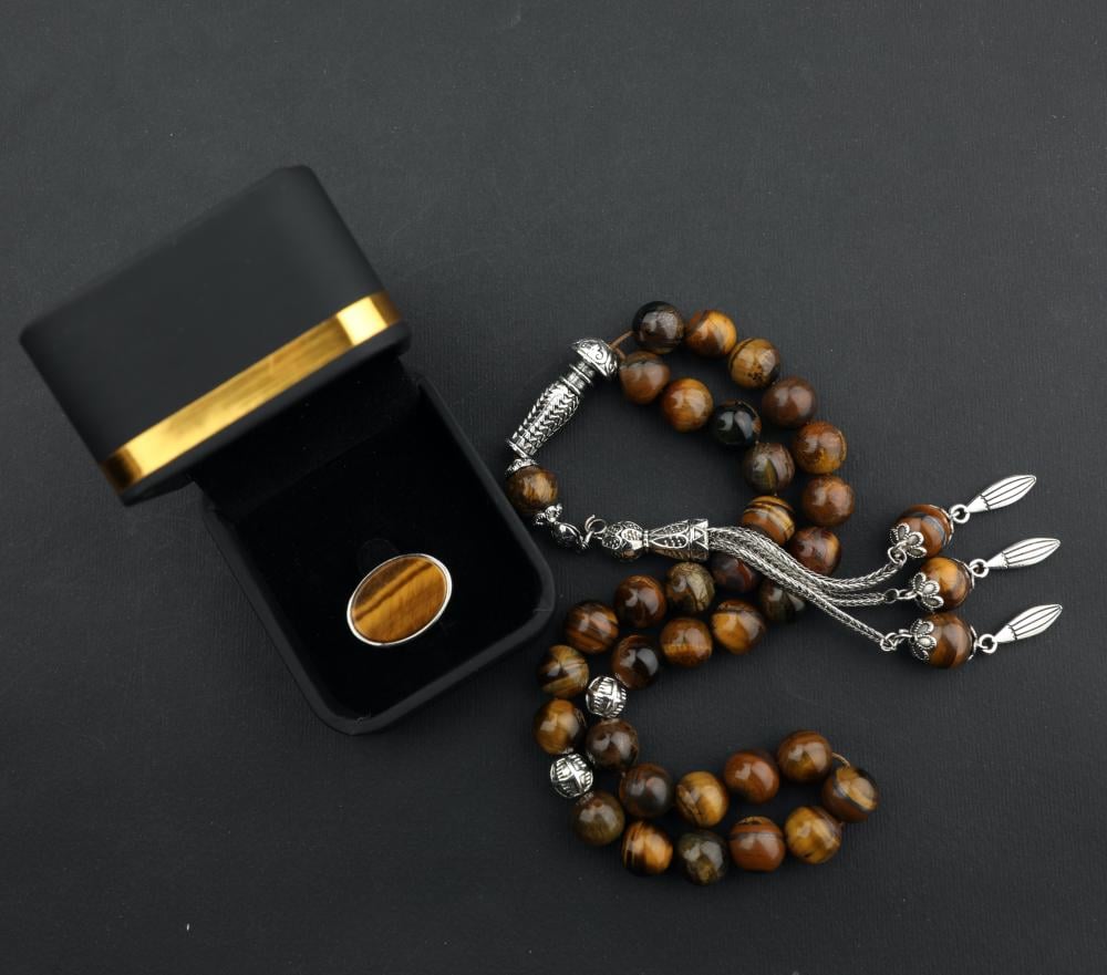• طقم سبحة وخاتم عين النمر يجمع بين الفخامة والرمزية.